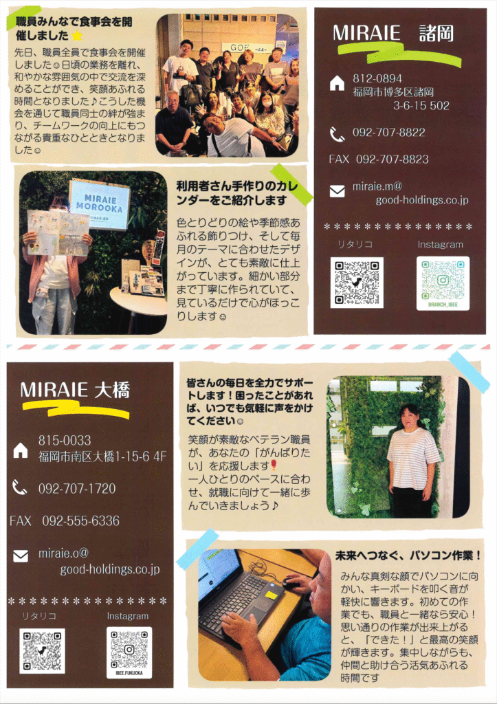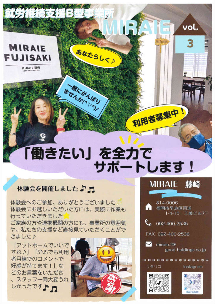 MIRAIE vol.3 2025 10/01 広報誌 広報誌 HPを公開いたしました。 MIRAIE vol.4 関連記事 MIRAIE vol.5 2025年12月1日 MIRAIE vol.4 2025年11月1日 MIRAIE vol.2 2025年9月1日 MIRAIE vol.1 2025年8月1日 i Bee FUKUOKA vol.27 2025年7月1日