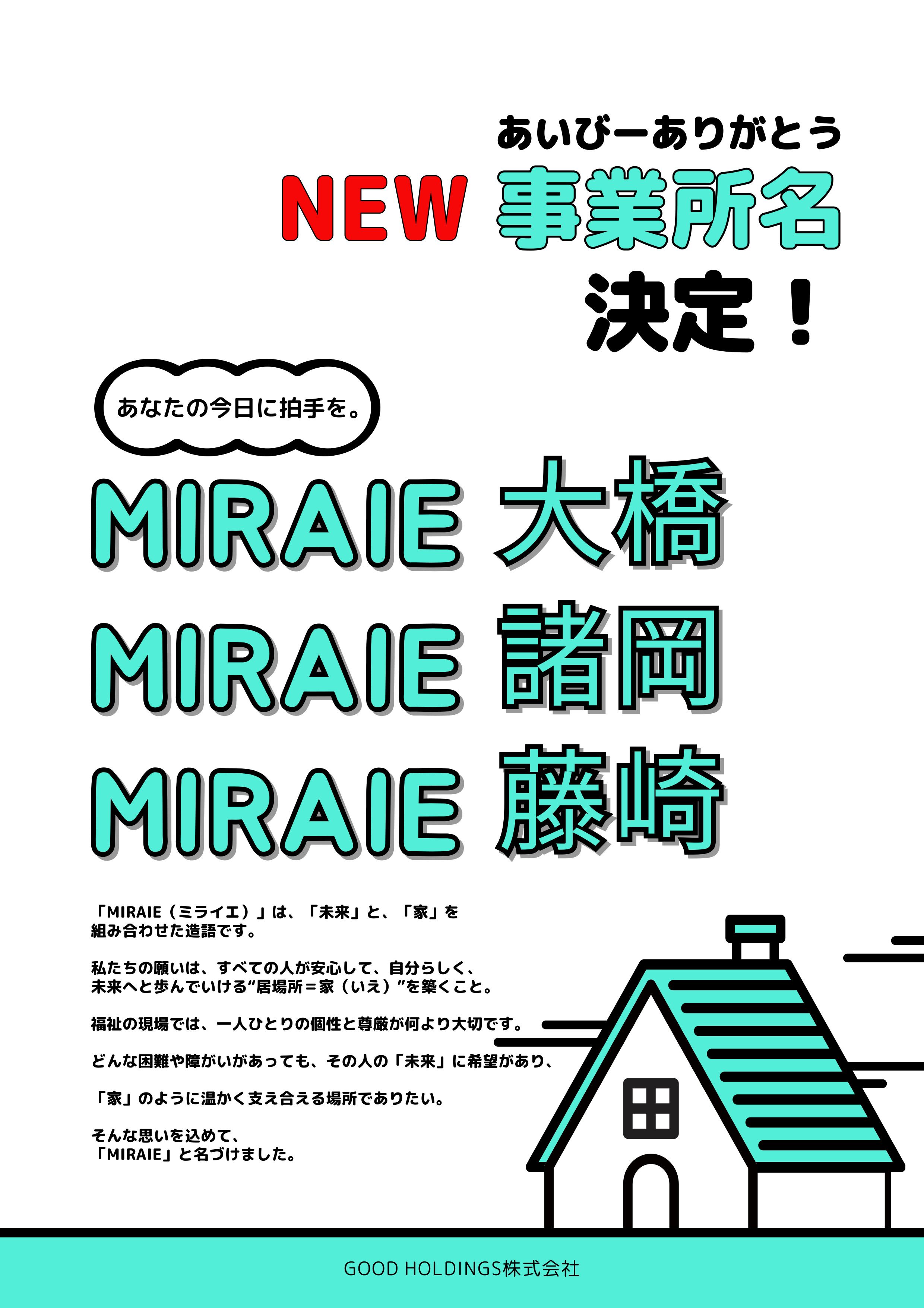 新 事業所名 決定! 2025 7/25 トピックス お知らせ トピックス お知らせ i Bee FUKUOKA vol.27 MIRAIE vol.1 関連記事 HPを公開いたしました。 2025年9月3日